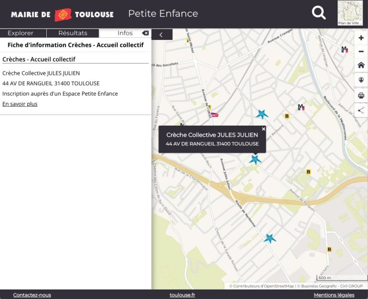 Les établissements (crèches, garderies), sont représentés par un pictogramme qui est localisé sur un point, positionné sur le fond de carte des rues de la ville. Les données vectorielles correspondent donc à un couple de coordonnées géographiques accompagné de données attributaires (nom de l'établissement).