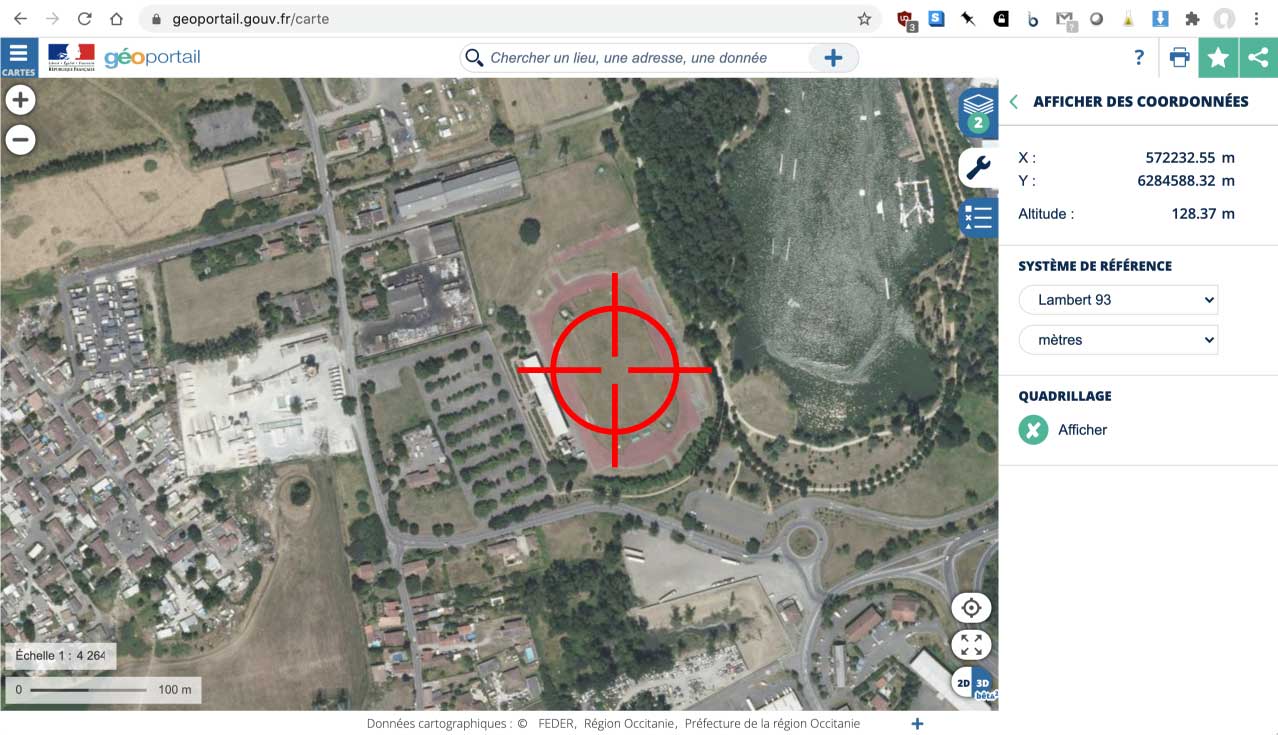 Dans le géoportail, il faut choisir la commune, Blagnac, puis la couche des photographies aériennes, zoomer sur le bout de la piste de l'aéroport et, dans le menu des outils à droite (icone clé), choisir d'afficher les coordonnées en Lambert-93.